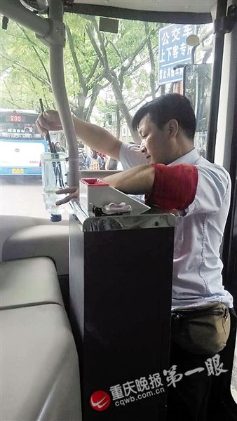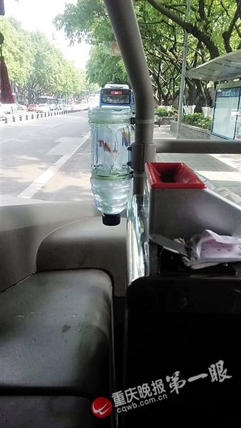 重慶晚報(bào)記者從前門上車,一眼就看見門柱上綁一個(gè)小號(hào)飲料瓶,票箱旁綁著一個(gè)大號(hào)飲料瓶,瓶子被白色扎帶和膠皮管牢牢系住,瓶口向下,瓶子底部被剪開朝上。大號(hào)瓶里有兩條小金魚,正歡快地游著。